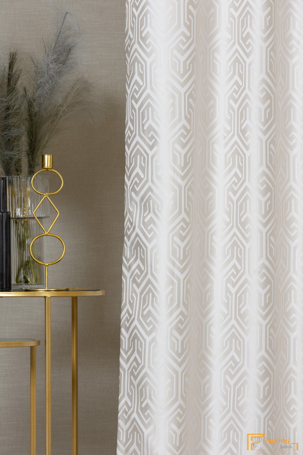 Egy dekor függöny, ami vonzza a tekintetet a térben. Mintázata labirintusra emlékeztető, kontrasztos színeivel egyszerre sejtelmes és határozott.