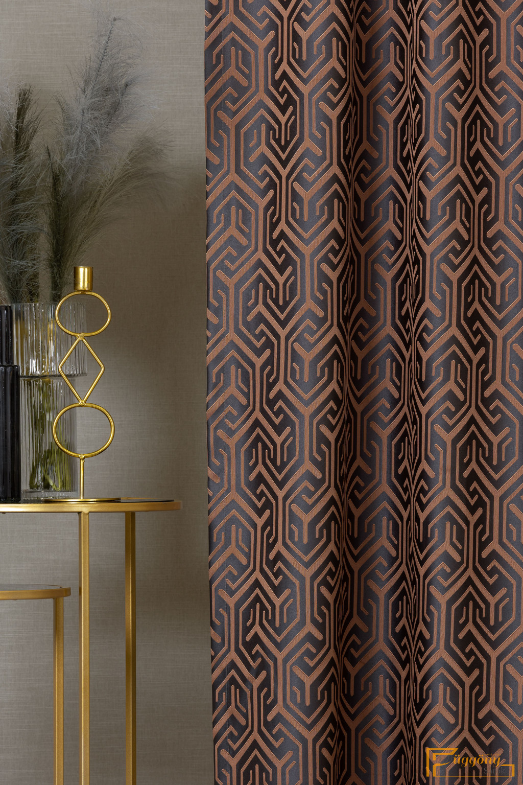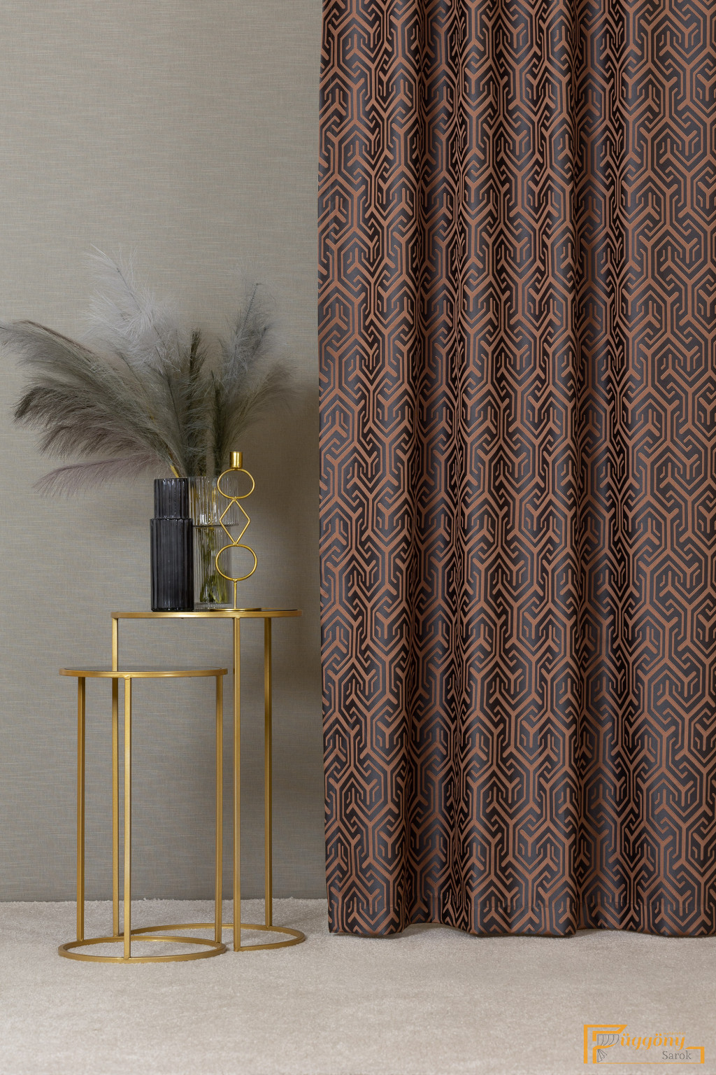 Egy dekor függöny, ami vonzza a tekintetet a térben. Mintázata labirintusra emlékeztető, kontrasztos színeivel egyszerre sejtelmes és határozott.