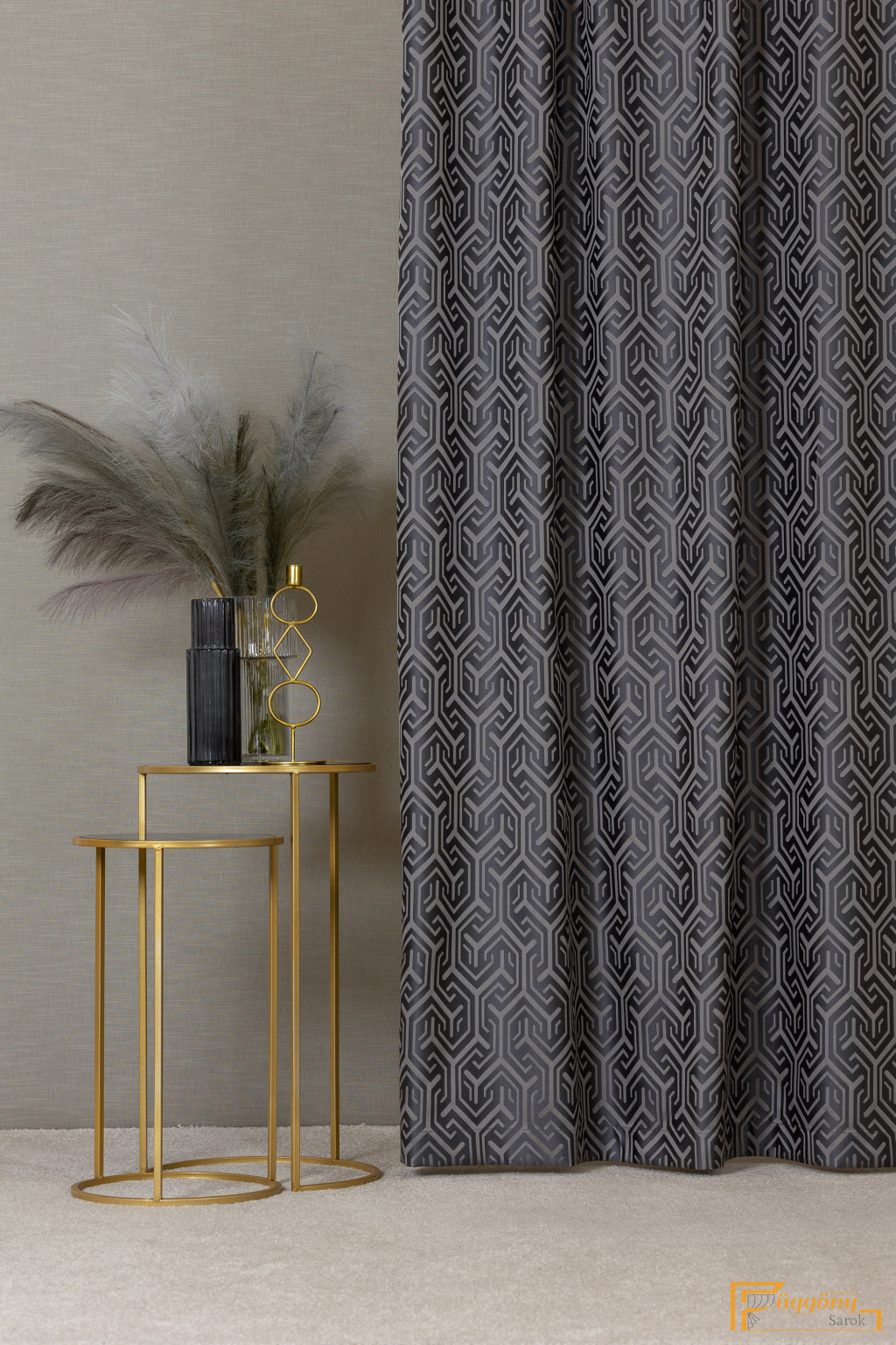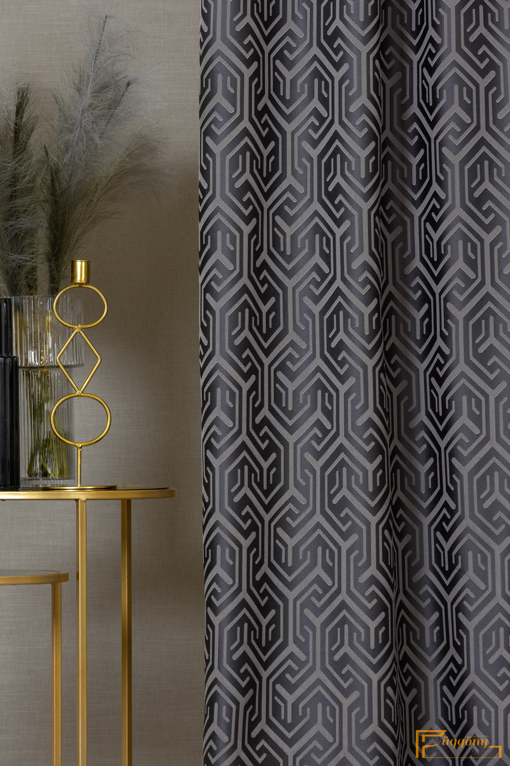 Egy dekor függöny, ami vonzza a tekintetet a térben. Mintázata labirintusra emlékeztető, kontrasztos színeivel egyszerre sejtelmes és határozott.