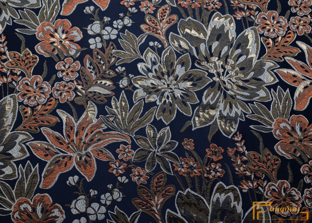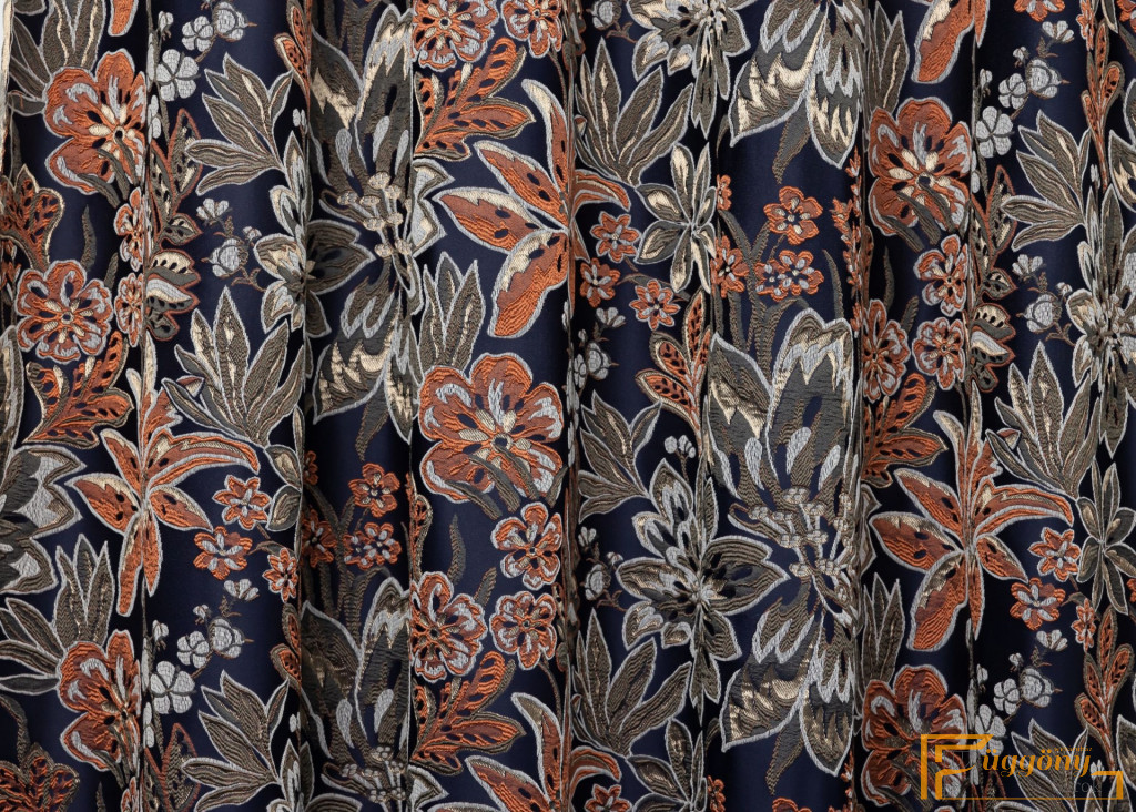 (6 szín) Meteora 3D mintával készült sötétítő függöny.305 cm. Sötétkék alapon terrakotta és fémes szürke színű virágok